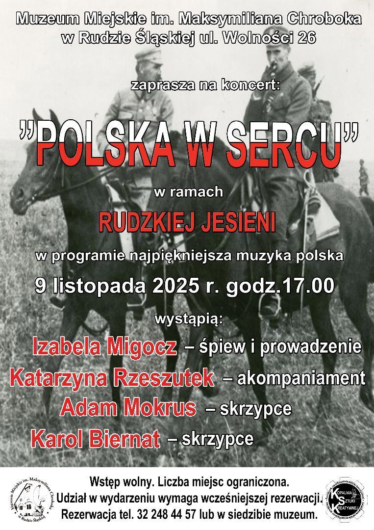 Warto dodać, że 9 listopada br. na godz. 17:00 na koncert „Polska w sercu” zaprasza Muzeum Miejskie im. M. Chroboka. Wystąpią: Izabela Migocz, Katarzyna Rzeszutek, Adam Mokrus oraz Karol Biernat. Będzie to okazja do wspólnego śpiewania pieśni patriotycznych. Wstęp na koncert jest bezpłatny, jednak ze względu na ograniczoną liczbę miejsc należy wcześniej zgłosić chęć udziału telefonicznie (32 248 44 57) lub za pośrednictwem mediów społecznościowych.