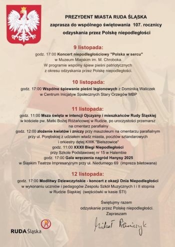 Jak co roku w tym uroczystym dniu odbędzie się msza św. w intencji Ojczyzny i mieszkańców Rudy Śląskiej. Rozpocznie się o godz. 11:00 w kościele pw. Matki Bożej Różańcowej w dzielnicy Ruda. Po nabożeństwie, ok. godz. 12:00, nastąpi przemarsz oraz złożenie kwiatów przy mauzoleum zbudowanym dla uczczenia poległych w walce o polskość na cmentarzu parafialnym przy ul. Porębskiej. Całość uświetni Orkiestra Dęta „Bielszowice” pod batutą Zygmunta Kliksa oraz chór pod kierunkiem Tomasza Ptoka.