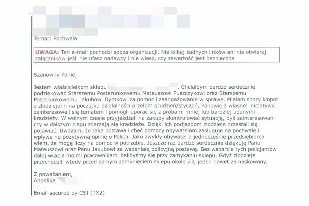 W piśmie szczególnie podkreślono działania st. post. Mateusza Puszczyka oraz post. Jakuba Dymka. Jak wskazano, policjanci byli w pełni zaangażowani i oddani sprawie, co przyczyniło się do rozwiązania problemu w jednym z lokalnych sklepów.