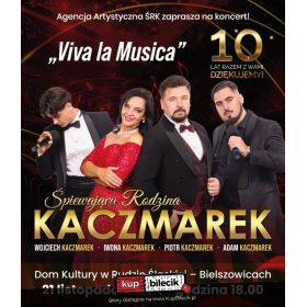 bilety: "Viva La Musica" to zupełnie nowy koncert jedynej w Polsce rodziny śpiewającej muzykę klasyczną. W wykonaniu Śpiewającej Rodziny Kaczmarek usłyszycie państwo tym razem najpiękniejsze melodie z operetki min. Wesołej wdówki, Hrabiny Marizy, Księżniczki Czardasza, czy Guditty, przeboje z musicali min: Skrzypka na dachu, My fair lady czy Upiora w operze, a także piękne standardy muzyki rozrywkowej, piosenki z repertuaru Franka Sinatry Elvisa Presleya, Poula Anki czy Luisa Armstronga. Śpiewająca Rodzina Kaczmarków artyści: Iwona Kaczmarek, Piotr Kaczmarek, Wojciech Kaczmarek, Adam KaczmarekŚpiewająca Rodzina Kaczmarków - dobrze znana w całej Polsce. Koncertują razem od 4 lat. Adam i Wojtek dali się poznać szerokiej publiczności po występie w programie Mam talent, odnosząc tamże ogromny sukces. Adam Karczmarek to również gość Festiwalu Piosenki Krajowej w Opolu. Bilety do nabycia na: KupBilecik.pl |